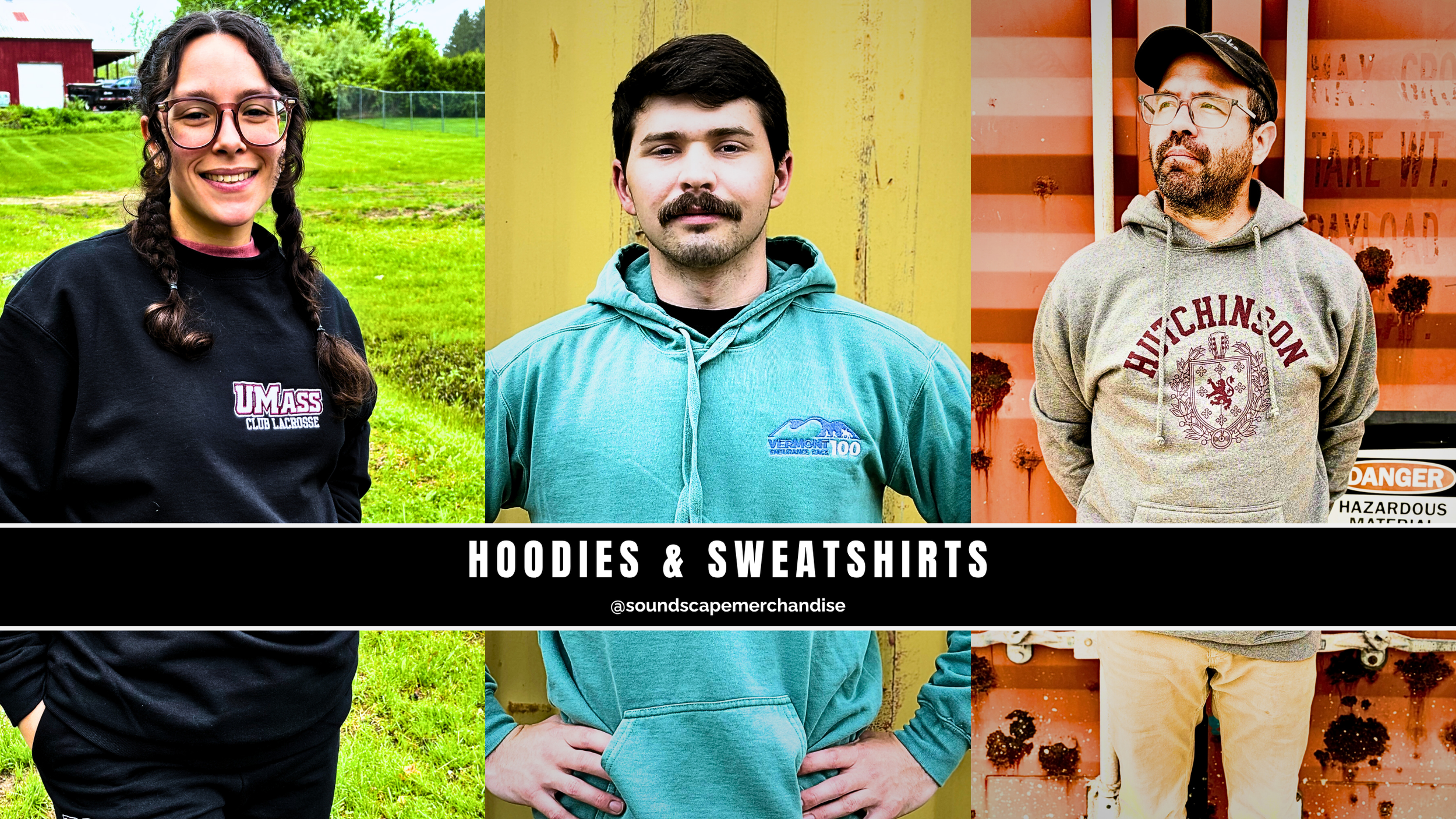 Three Soundscape team members showing off custom hoodies and sweatshirts. Clean embroidery, bold prints, and cozy fits made to last beyond the merch table. Real-deal gear, made by the crew who lives it.